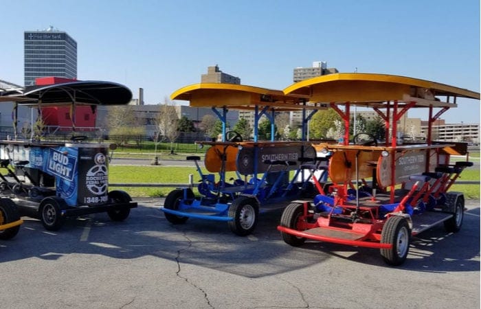 Basically you jump onboard this contraction which is on bikes, and everyone pedals their way around town, while having a few drinks and sightseeing around downtown Rochester.