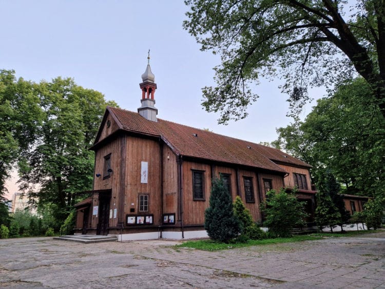 Esta pequeña iglesia está construida íntegramente de madera, y fue trasladada a su actual ubicación (en frente de Manufaktura) en 1888.